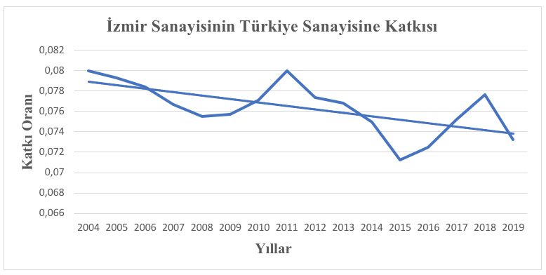 İlk olarak İzmir sanayisinin ülke sanayisinde nasıl bir paya sahip olduğuna bakalım. TÜİK’in GSYH verilerine göre 2004 ve 2019 yılları arasında bu payın yüzde 7.9 ve 7.1 arasında değiştiği görülmekte. Ama bu 16 yıllık trendin eğilimi Grafik 1’de görüldüğü gibi biraz aşağı yönlü. Yani İzmir sanayisinin Türkiye sanayisi içindeki payında hafif bir azalma eğilimi var.