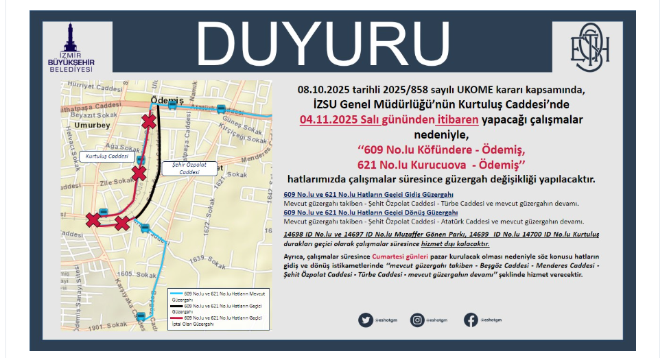 İZSU’nun altyapı çalışmaları nedeniyle 795 - Ödemiş-Torbalı, 609 - Köfündere-Ödemiş, 621 - Kurucuova-Ödemiş, 611 - Çaylı-Ödemiş, 616 - Kaymakçı-Ödemiş, 618 - Ertuğrulköy-Ödemiş, 796 - Beydağ-Ödemiş ve 803 - Kiraz-Ödemiş hatlarının güzergahlarında geçici düzenlemeler yapılacak.