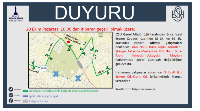 ESHOT tarafından gerçekleştirilen duyuruda şu ifadeler yer aldı: 20 Ekim Pazartesi 10:00 dan itibaren geçerli olmak üzere; İZSU Genel Müdürlüğü tarafından Buca ilçesi Erdem Caddesi üzerinde (8 Sk. ve 61 Sk. arasında) yapılan Altyapı Çalışmaları nedeniyle, 866 No.lu Buca Toplu Konutları- Şirinyer Aktarma Merkezi ve 869 No.lu Buca Toplu Konutları-Üçkuyular Meydan hatlarımızda geçici güzergah değişikliğine gidilecektir. Hatlarımız çalışmalar süresince, 3 Sk.-8 Sk.- Erdem Cd.-Kibris Cd. istikametinde hizmet verecektir. Kentlimizin bilgisine sunarız.”