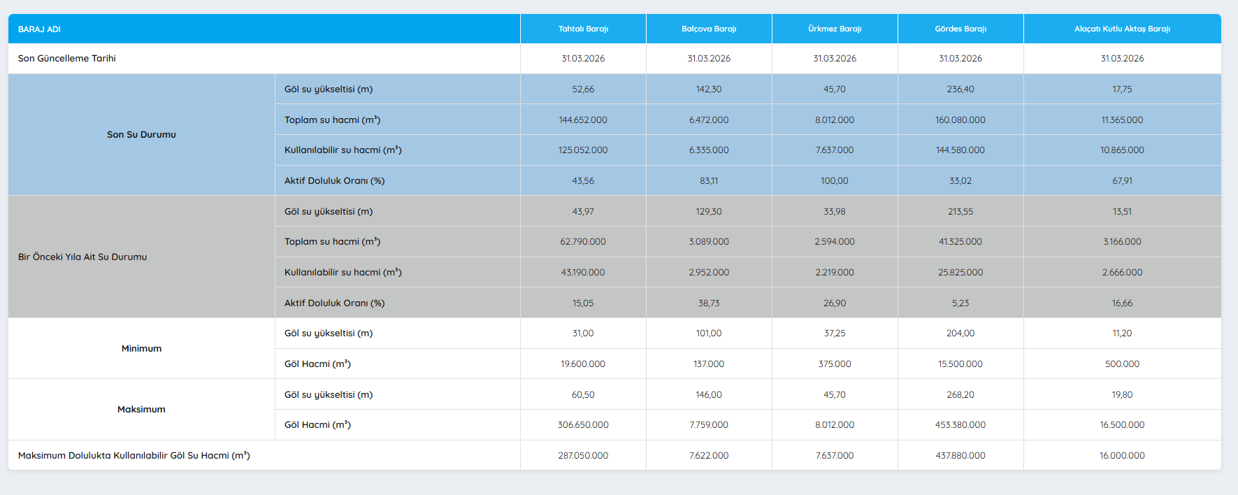 İzmir Su ve Kanalizasyon İdaresi (İZSU) tarafından 31 Mart 2026 tarihli güncel baraj doluluk verileri kamuoyuyla paylaşıldı. İzmir genelinde son dönemde etkili olan yağışların ardından baraj seviyelerinde artış yaşandığı görülürken bazı barajlarda doluluk oranlarının kritik seviyelerden yukarı yönlü hareket ettiği dikkat çekti.İşte detaylar..