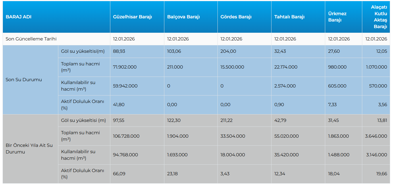 İzmir Su ve Kanalizasyon Genel Müdürlüğü’nün 12 Ocak 2026 tarihli verilerine göre Balçova Barajı %0,00, Gördes Barajı %0,00, Tahtalı Barajı %0,90, Ürkmez Barajı %7,33, Güzelhisar Barajı %41,80, Alaçatı Kutlu Aktaş Barajı ise %3,56 doluluk oranına sahip.
