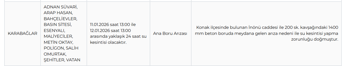 Karabağlar ilçesinde ise Adnan Süvari, Arap Hasan, Bahçelievler, Basın Sitesi, Esenyalı, Maliyeciler, Metin Oktay, Poligon, Salih Omurtak, Şehitler ve Vatan mahalleleri de 11.01.2026 saat 13:00 ile 12.01.2026 saat 13:00 arasında yaklaşık 24 saatlik su kesintisinden etkilenecek.