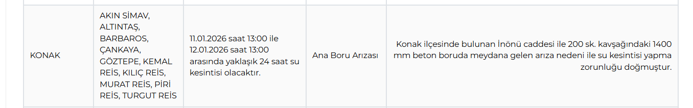 Kesinti kapsamında Konak ilçesinde Akın Simav, Altıntaş, Çankaya, Göztepe, Kemal Reis, Kılıç Reis, Murat Reis, Piri Reis ve Turgut Reis mahallelerine 11.01.2026 saat 13:00 ile 12.01.2026 saat 13:00 arasında yaklaşık 24 saat su kesintisi bekleniyor.. İZSU ekipleri arızayı gidermek amacıyla gece boyunca aralıksız görev yapacak. Arızanın giderilmesinin ardından 12 Ocak Pazartesi saat 13.00'te hatta kademeli olarak yeniden su verilmesi planlanıyor.