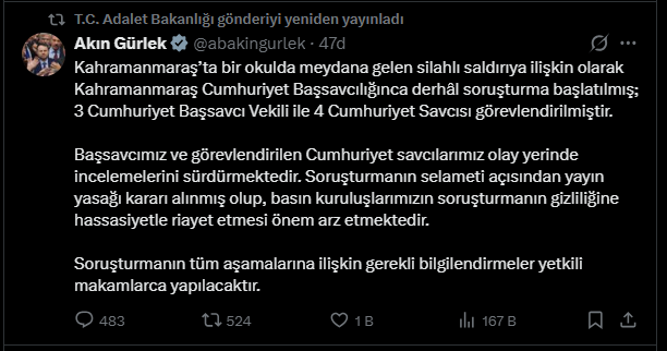 Silahlı saldırıya ilişkin olarak Kahramanmaraş Cumhuriyet Başsavcılığı tarafından soruşturma başlatıldığını belirten Adalet Bakanı Akın Gürlek, sosyal medya hesabından yaptığı paylaşımda şu ifadelere yer verdi: