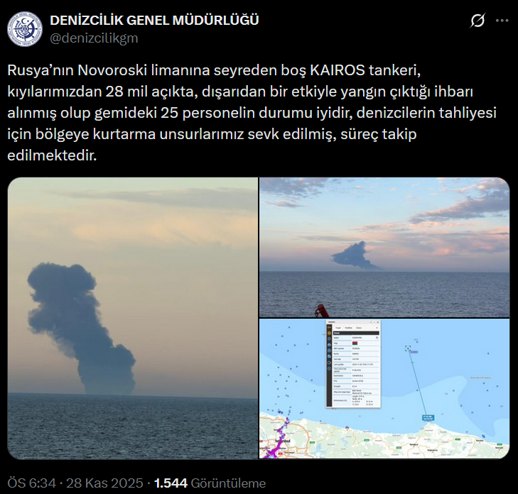 "Rusya’nın Novoroski limanına seyreden boş KAIROS tankeri, kıyılarımızdan 28 mil açıkta, dışarıdan bir etkiyle yangın çıktığı ihbarı alınmış olup gemideki 25 personelin durumu iyidir, denizcilerin tahliyesi için bölgeye kurtarma unsurlarımız sevk edilmiş, süreç takip edilmektedir."