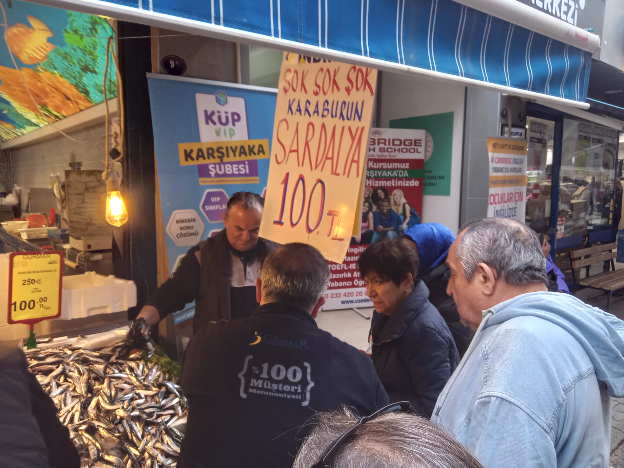 Karşıyaka Çarşı’da hafta içi yaşanan hareketlilik dikkat çekti. Salı günü bir balıkçı tezgâhının önünde sardalya almak isteyen vatandaşlar kuyruk oluşturdu. Tezgâhta sardalyanın kilogram fiyatının 100 TL olarak yazılması, kısa sürede yoğunluğa neden oldu.