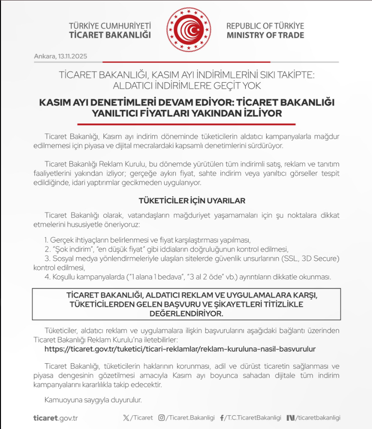 Ticaret Bakanlığı tarafından yapılan açıklamada, kasım ayında yürütülen tüm indirimli satış, reklam ve tanıtım faaliyetlerinin Reklam Kurulu tarafından izlendiği belirtildi. Gerçeğe aykırı fiyat, sahte indirim veya yanıltıcı görseller tespit edilmesi durumunda idari yaptırımların gecikmeden uygulanacağı ifade edildi.