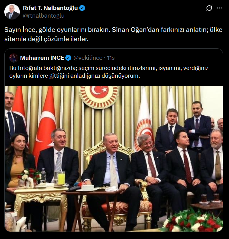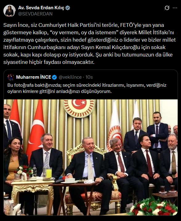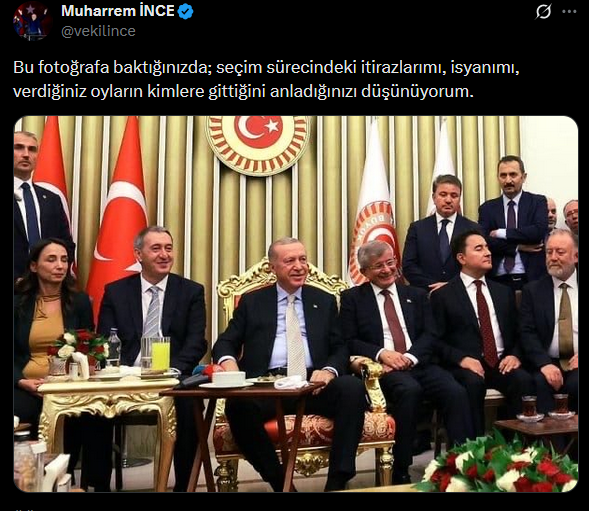Memleket Partisi’ni kapatarak CHP’ye katılan Muharrem İnce, TBMM’nin yeni yasama yılı açılışında Erdoğan, Davutoğlu, Babacan ile birlikte DEM Parti Eş Genel Başkanları Tuncer Bakırhan ve Tülay Hatimoğulları’nın da yan yana oturduğu fotoğrafı paylaşarak dikkat çeken bir açıklama yaptı. İnce, paylaşımında seçim sürecindeki itirazlarını yeniden gündeme getirerek, “Bu fotoğrafa baktığınızda; seçim sürecindeki itirazlarımı, isyanımı, verdiğiniz oyların kimlere gittiğini anladığınızı düşünüyorum” dedi. Muharrem İnce’ye, CHP’nin eski Genel Başkanı Kemal Kılıçdaroğlu’na yakınlığıyla tanınan İzmir milletvekilleri Sevda Erdan Kılıç ve Rıfat Nalbantoğlu tarafından yanıt geldi.