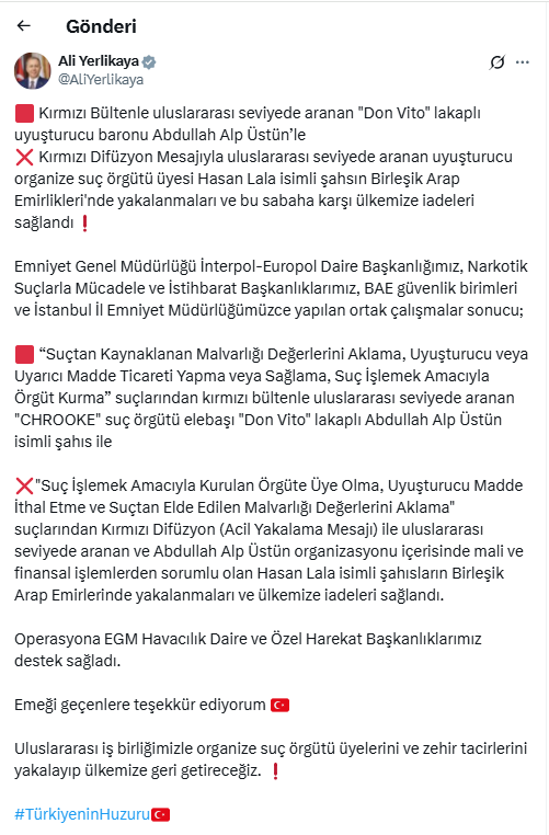 Suç İşlemek Amacıyla Kurulan Örgüte Üye Olma, Uyuşturucu Madde İthal Etme ve Suçtan Elde Edilen Malvarlığı Değerlerini Aklama" suçlarından Kırmızı Difüzyon (Acil Yakalama Mesajı) ile uluslararası seviyede aranan ve Abdullah Alp Üstün organizasyonu içerisinde mali ve finansal işlemlerden sorumlu olan Hasan Lala isimli şahısların Birleşik Arap Emirlerinde yakalanmaları ve ülkemize iadeleri sağlandı. Operasyona EGM Havacılık Daire ve Özel Harekat Başkanlıklarımız destek sağladı."