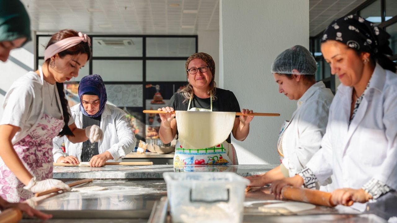 Konak Belediyesi’nin İzmir Büyükşehir Belediyesi (İzBB) Meslek Fabrikasıyla birlikte yürüttüğü eğitim programı kapsamında Toros Sosyal Tesisleri’nde düzenlenen Geleneksel Hamur Ürünleri Yapımı Kursundan mezun olan kadınlar sertifikalarını aldı.