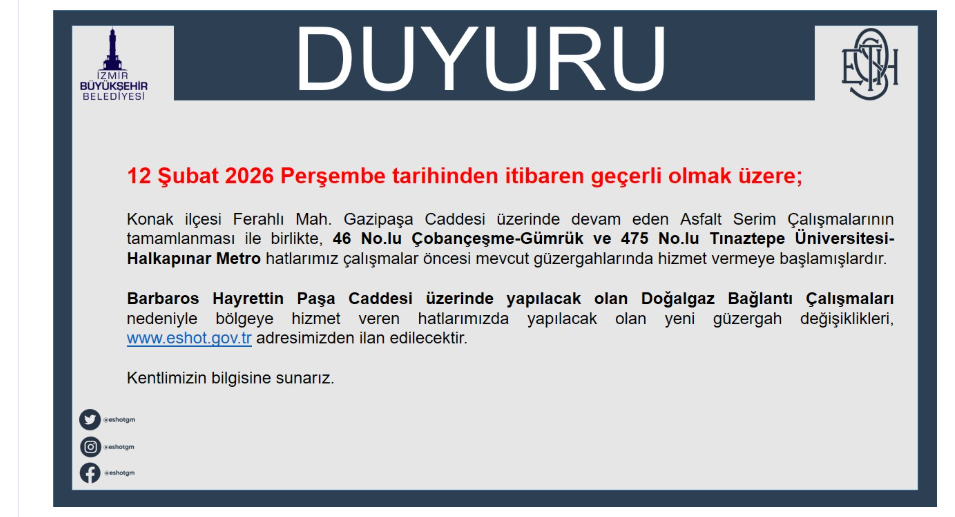 “12 Şubat 2026 Perşembe tarihinden itibaren geçerli olmak üzere; Konak ilçesi Ferahlı Mah. Gazipaşa Caddesi üzerinde devam eden Asfalt Serim Çalışmalarının tamamlanması ile birlikte, 46 No.lu Çobançeşme-Gümrük ve 475 No.lu Tınaztepe Üniversitesi-Halkapınar Metro hatlarımız çalışmalar öncesi mevcut güzergahlarında hizmet vermeye başlamışlardır.