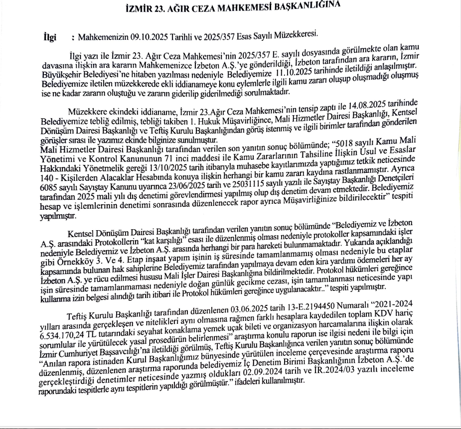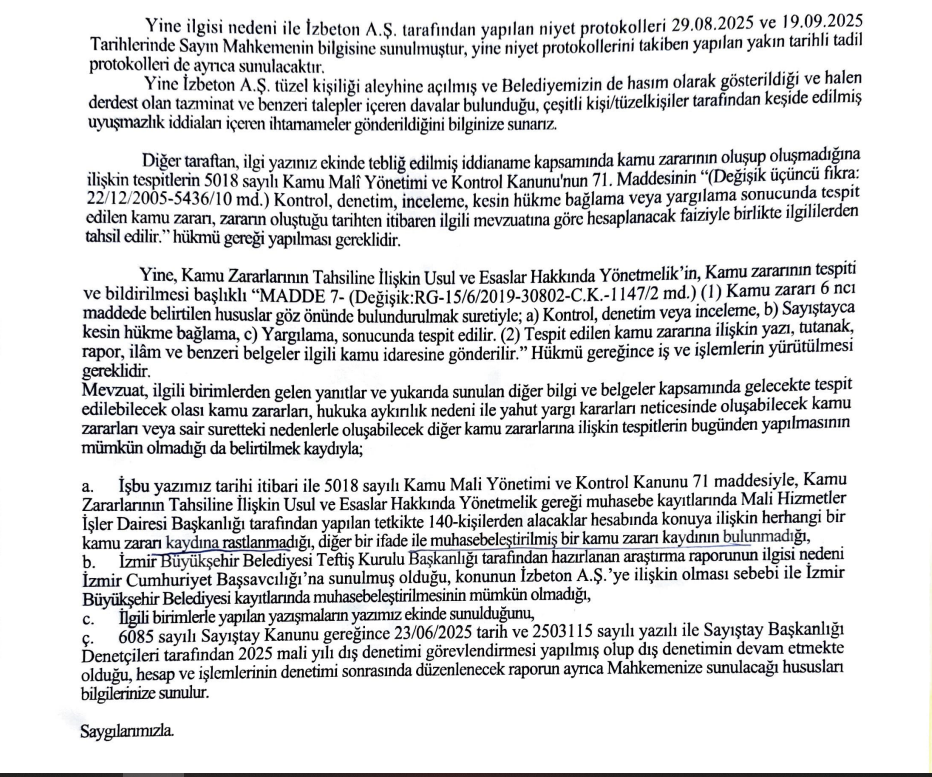 İzmir Büyükşehir Belediyesi’ne yönelik kooperatif soruşturmasında eski İzmir Büyükşehir Belediye Başkanı Tunç Soyer ile CHP İzmir İl Başkanı Şenol Aslanoğlu’nun da aralarında bulunduğu tutuklu ve sanık konumundaki isimler bugün hakim karşısına yeniden çıkıyor. Davanın gidişatı için hayati önemi bulunan, mahkemenin İzmir Büyükşehir Belediyesi’nden istediği ‘kamu zararı’ yazısı, duruşmada Av. Özkan Yücel tarafından mahkeme heyetine elden teslim edildi. Duruşmaya yetişmeyeceği konuşulan belgede, “Konuya ilişkin herhangi bir kamu zararı kaydına rastlanmadığı, diğer bir ifadeyle muhasebeleştirilmiş bir kamu zararı kaydının bulunmadığı...” ifadeleri yer aldı.