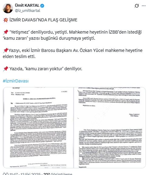"Yetişmez’ deniliyordu, yetişti. Mahkeme heyetinin İZBB’den istediği ‘kamu zararı’ yazısı bugünkü duruşmaya yetişti. Yazıyı, eski İzmir Barosu Başkanı Av. Özkan Yücel mahkeme heyetine elden teslim etti. Yazıda, ‘kamu zararı yoktur’ deniliyor."