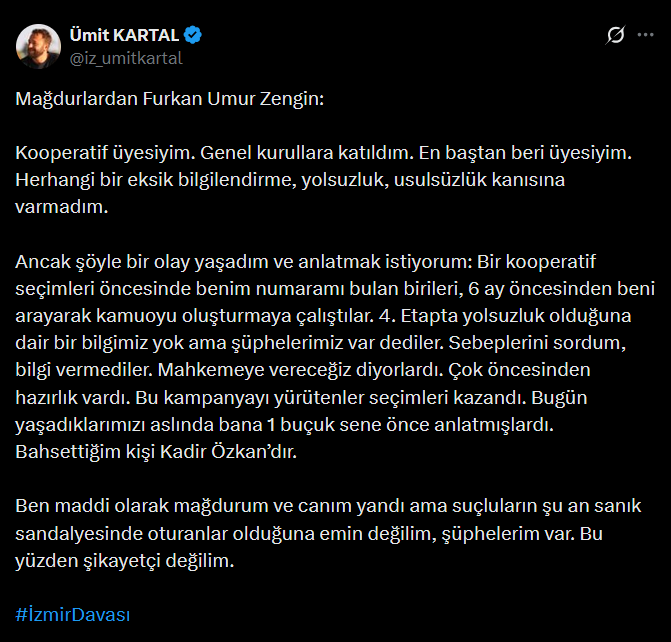 İzmir Büyükşehir Belediyesi’ne ilişkin yürütülen kooperatif soruşturmasında duruşma devam ediyor. Mağdur sıfatıyla ifade veren Furkan Umur Zengin, kooperatifin kuruluşundan itibaren üyesi olduğunu ancak yolsuzluk veya usulsüzlük kanısına varmadığını aktardı. Kooperatif seçimlerinin 6 ay öncesinde tuhaf bir arama aldığını söyleyen Zengin, "Bir kooperatif seçimleri öncesinde benim numaramı bulan birileri, 6 ay öncesinden beni arayarak kamuoyu oluşturmaya çalıştılar. 4. Etapta yolsuzluk olduğuna dair bir bilgimiz yok ama şüphelerimiz var dediler. Sebeplerini sordum, bilgi vermediler. Mahkemeye vereceğiz diyorlardı. Çok öncesinden hazırlık vardı. Bu kampanyayı yürütenler seçimleri kazandı. Bugün yaşadıklarımızı aslında bana 1 buçuk sene önce anlatmışlardı. Bahsettiğim kişi Kadir Özkan’dır" dedi.