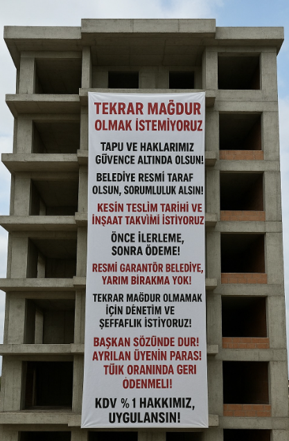 Kamuoyunda kooperatif davası olarak bilinen dava süreci devam ederken, kentsel dönüşüm ve kooperatif mağduru 4 kooperatif yönetimi ve bir mağdur kooperatifin üyeleri, yapılan iyi niyet protokollerinin ardından bir kez daha mağdur olmamak için 3 farklı şantiyede eylem yapacak. Eylemde basın açıklamaları ile birlikte şantiyelere taleplerin yer aldığı afişler asılacak.