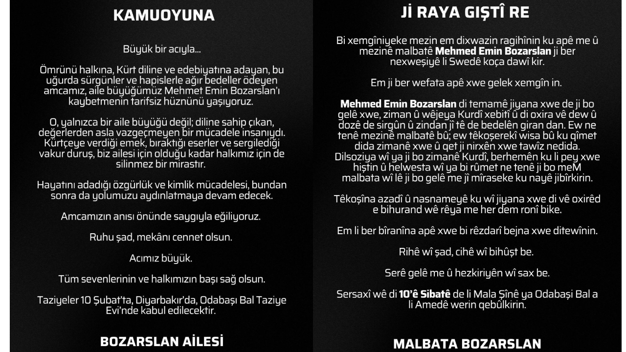 Bozarslan ailesi tarafından yapılan yazılı açıklamada, Mehmet Emin Bozarslan’ın yaşamı boyunca Kürt dili ve edebiyatı için çalıştığı, bu süreçte sürgünler ve hapis cezalarıyla karşı karşıya kaldığı ifade edildi. Açıklamada, Bozarslan’ın Kürtçeye kazandırdığı eserlerin ve bıraktığı çalışmaların kalıcı bir miras olduğu vurgulandı.Aile tarafından yapılan açıklamada, taziyelerin 11 Şubat’ta 13.00–16.00 saatleri arasında İsveç’in Uppsala kentindeki Stabby Prästgård’da kabul edileceği ifade edildi. Ayrıca taziyelerin 10 Şubat’ta Diyarbakır’da Odabaşı Bal Taziye Evi’nde de kabul edileceği duyuruldu.