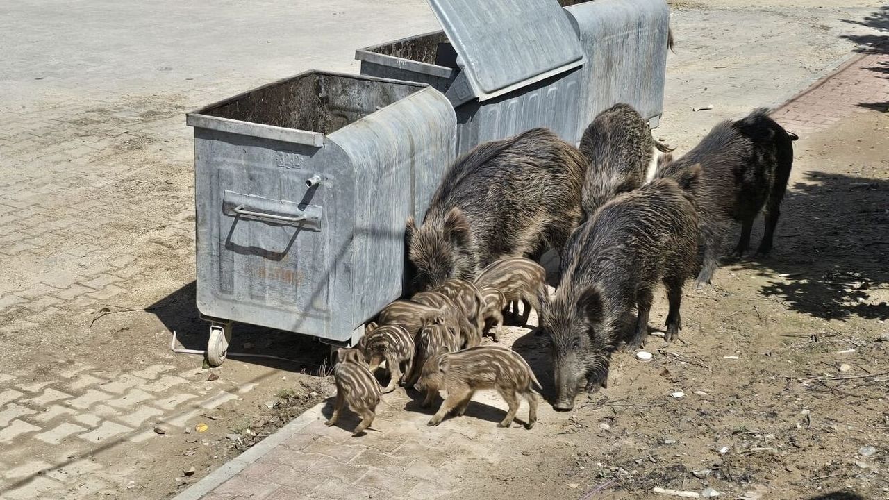 Aydın'ın Kuşadası ilçesinde yiyecek arayan yaban domuzları ilçe merkezine indi. Gazibeğendi bölgesine gelen yaban domuzu ve yavruları, çöp konteynerlerinin çevresinde yiyecek aradı. Durumu gören bir kişi, evinden getirdiği ekmekleri domuzlara verdi.