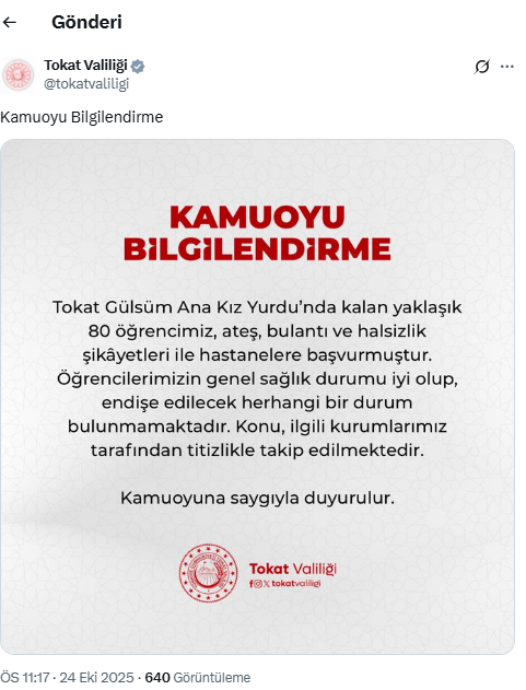 "Tokat Gülsüm Ana KYK Kız Yurdu’nda kalan yaklaşık 80 öğrencimiz, ateş, bulantı ve halsizlik şikâyetleri ile hastanelere başvurmuştur.