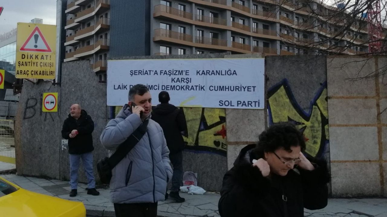 Pankartın kısa sürede gericiler tarafından hedef alınmasının ardından Sol Partili iki yöneticinin gözaltına alındığı öğrenildi.