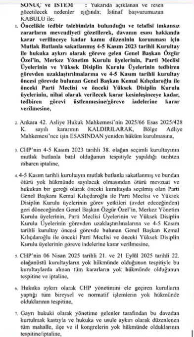 Sözcü’de yer alan habere göre; Eski Hayat Büyükşehir Belediye Başkanı ve CHP’nin önceki kurultay delegeleri CHP'nin 38. Kurultayı'nın iptali davası için istinaf sürecini başlattı. Ankara 42. Asliye Hukuk Mahkemesi, CHP'nin 4-5 Kasım 2023'te yapılan 38. Olağan Kurultayı'nın iptali davasında verdiği davanın "konusuz kalması" sebebiyle "karar verilmesine yer olmadığına" dair hükmün gerekçesini açıkladı.