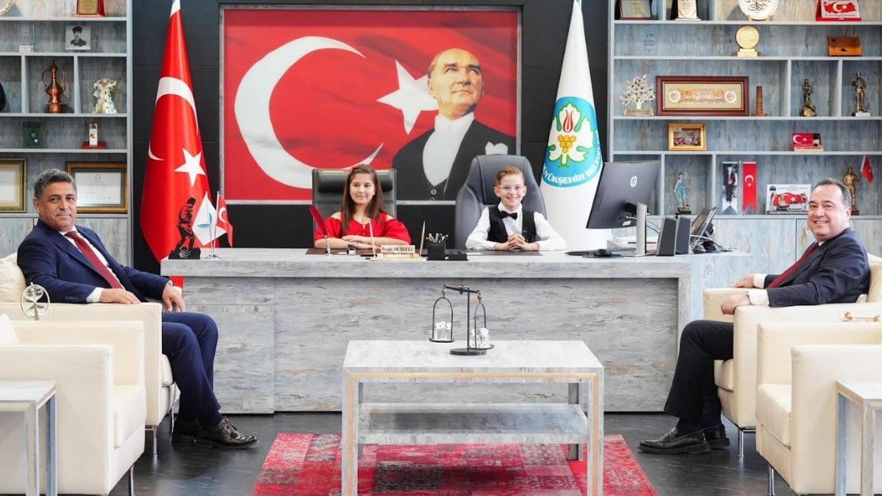 Organize Sanayi İlkokulu öğrencisi Damla Dursun ile 23 Nisan Ulusal Egemenlik İlkokulu öğrencisi Mustafa Atak, Başkan Dutlulu’nun makamına konuk oldu. Programda Manisa Büyükşehir Belediyesi Genel Sekreteri Burak Deste de yer aldı.