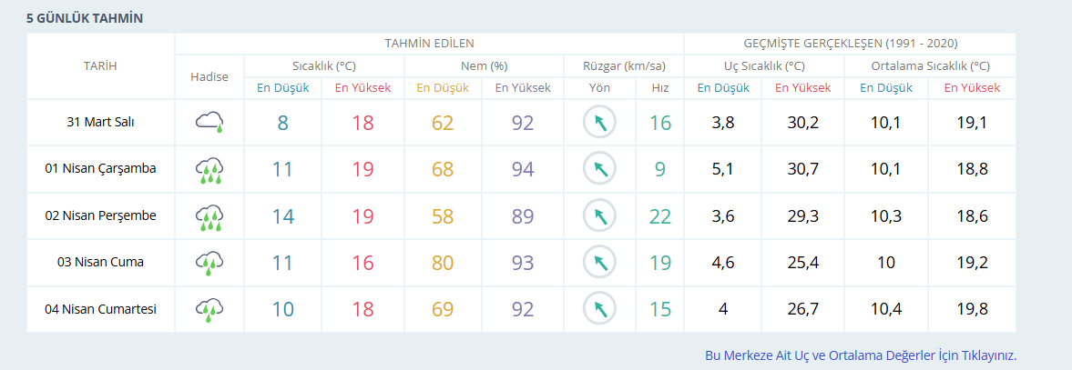 İzmir güne mevzi sağanak yağışlı bir gökyüzüyle başlarken bugünden itibaren kentte hafta boyu yer yer devam edecek yağışların başlaması öngörülüyor. 31 Mart tarihinde termometreler 18 derecelerde seyredecek. 1 Nisan Çarşamba günü ise gök gürültülü sağanak yağışlı bir hava bekleniyor. Termometreler 19 derece civarında seyredecek. 2 Nisan Perşembe günü ise termometrelerin aynı şekilde 19 derecelerde seyretmesi bekleniyor ve yağışlar devam edecek. 3 Nisan Cuma gübü aynı şekilde yağışların devam etmesi beklenirken termometrelerin 18 derecelerde seyretmesi öngörülüyor.