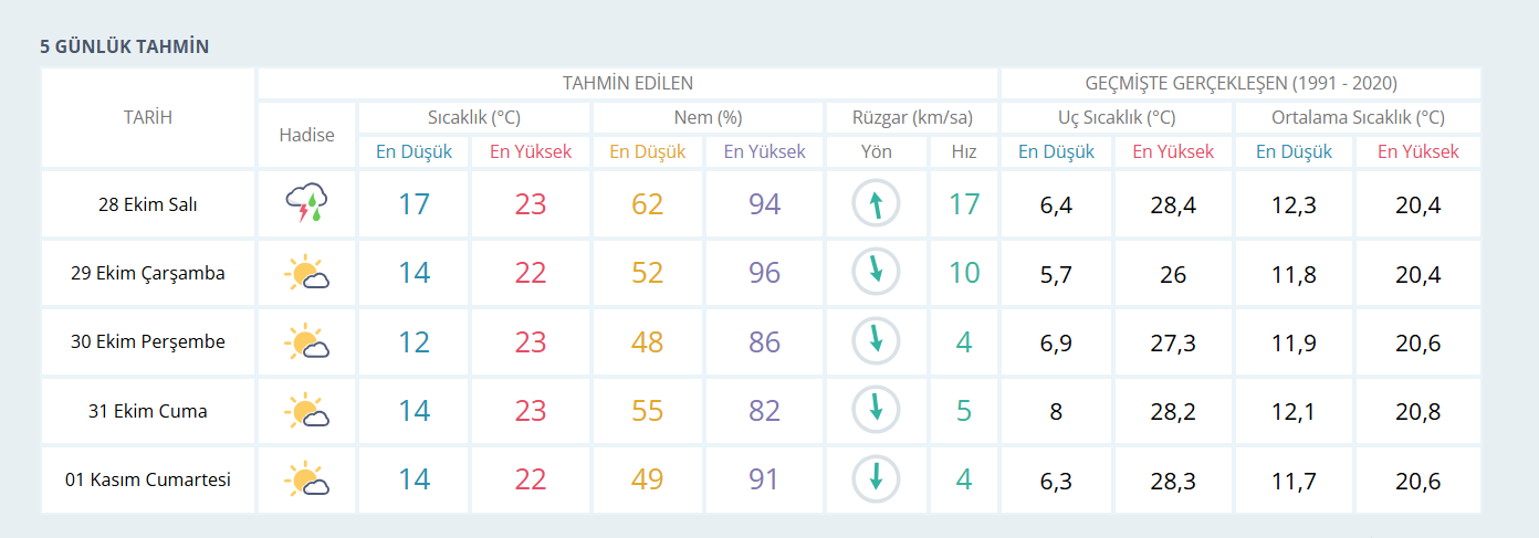 28 Ekim Salı günü İzmir genelinde gök gürültülü sağanak yağış beklenirken sıcaklıklar 23 dereceye kadar düşecek. 29 Ekim Çarşamba günü sıcaklık 22 derece olacak. 30 Ekim Perşembe ve 31 Ekim Cuma günleri ise hava sıcaklıklarının 23 derece civarında seyretmesi bekleniyor.