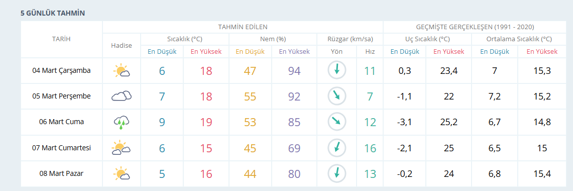 Meteoroloji Genel Müdürlüğü verilerine göre 4 Mart Çarşamba günü İzmir’de hava parçalı bulutlu olacak ve sıcaklığın 18 dereceye ulaşması bekleniyor. 5 Mart Perşembe günü de sıcaklığın 18 derece olması ve havanın bulutlu seyretmesi öngörülüyor. 6 Mart Cuma günü ise sıcaklığın 19 dereceye çıkması beklenirken İzmir'de sağanak yağışlı hava tahmin ediliyor.