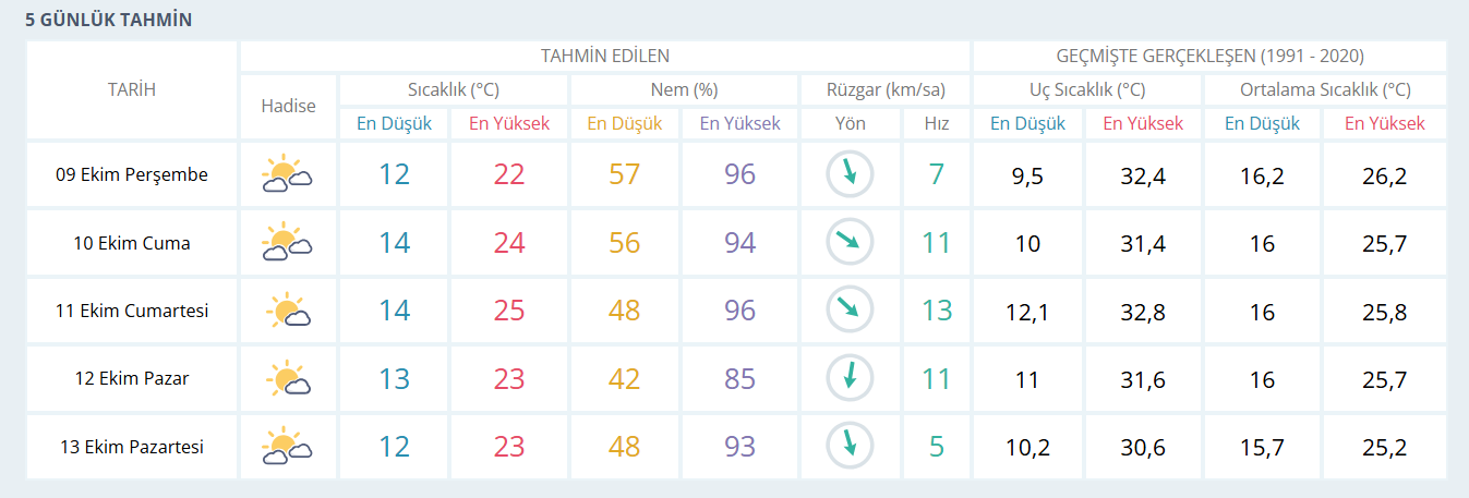 İzmir’de bu hafta hava sıcaklıkları giderek artacak. 9 Ekim Perşembe günü 22 derece olan sıcaklık, 10 Ekim Cuma günü 24 dereceye çıkacak. 11 Ekim Cumartesi günü 25 dereceye ulaşacak sıcaklık 12 Ekim Pazar günü 23 derece civarında seyredecek.