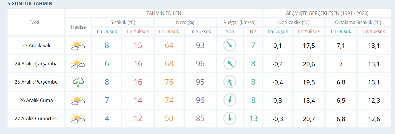 26 Aralık Cuma günü yağışların etkisini kaybedeceği havanın bulutlu olacağı ve sıcaklığın 14 dereceye düşeceği tahmin ediliyor. 27 Aralık Cumartesi günü ise hava parçalı bulutlu olacak, sıcaklıkların 12 dereceye kadar gerilemesi bekleniyor.