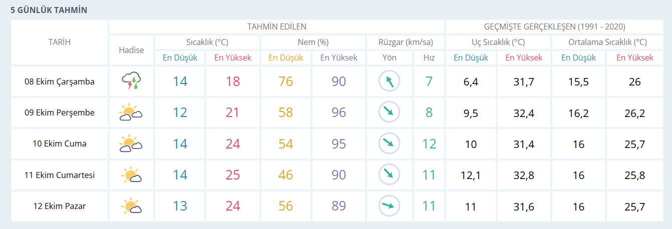 İzmir'de sıcaklıklar hafta boyunca kademeli olarak artacak. Kritik gün bugün. 8 Ekim Çarşamba günü 18 derece olan hava sıcaklığı, 9 Ekim Perşembe günü 21 dereceye, 10 Ekim Cuma günü ise 24 dereceye kadar çıkacak. 11 Ekim Cumartesi günü sıcaklık 25 derece, 12 Ekim Pazar günü ise 24 derece civarında seyredecek.