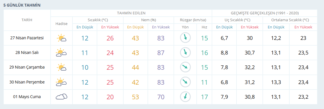 Haftanın ilk günü olan 27 Nisan Pazartesi günü İzmir’de hava parçalı güneşli olacak ve sıcaklıkların 26 derece civarında seyretmesi bekleniyor. 28 Nisan Salı günü ise termometreler 24 dereceyi gösterecek. Hafta ortasında çarşamba ve perşembe günlerinde sıcaklıklar yeniden 25 derece seviyelerinde ölçülecek.