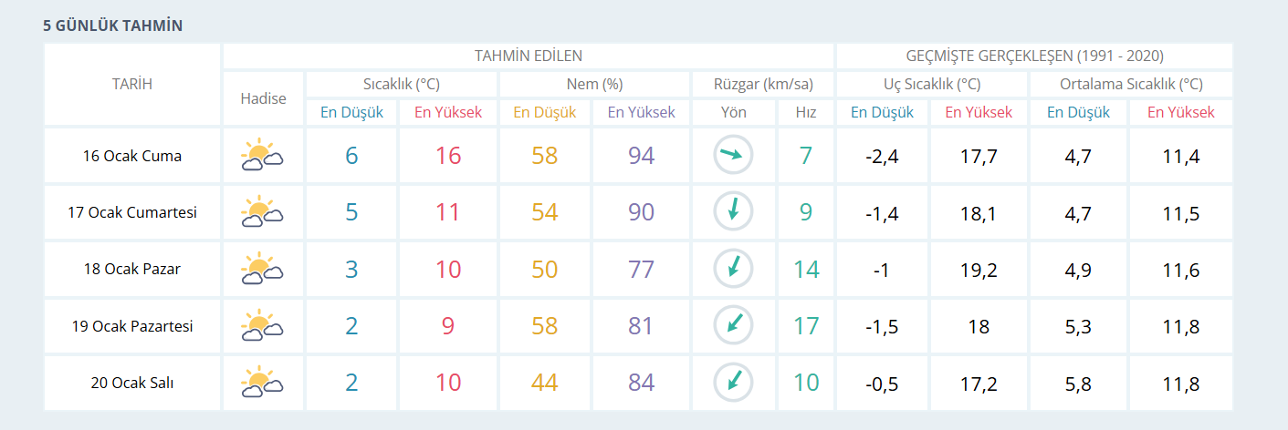 Meteoroloji verilerine göre İzmir’de 16 Ocak Cuma günü hava sıcaklığının 16 derece civarında seyretmesi bekleniyor. 17 Ocak Cumartesi günü sıcaklığın 11 dereceye düşeceği tahmin edilirken 18 Ocak Pazar günü ise hava sıcaklığının bugüne kıyasla yaklaşık 5 derece azalarak 10 dereceye gerilemesi öngörülüyor. 19 Ocak Pazartesi günü sıcaklığın 9 dereceye kadar düşmesi, 20 Ocak Salı günü ise yeniden 10 derece seviyelerinde olması bekleniyor. Açıklanan tahminlere göre hafta boyunca İzmir genelinde yağış öngörülmüyor.