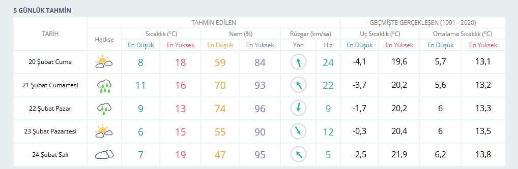 Meteoroloji verilerine göre İzmir’de 20 Şubat Cuma günü genel olarak bulutlu bir hava öngörülüyor. Bazı ilçeler için şiddetli yağış uyarısı yapılırken sıcaklığın gün içinde 18 dereceye kadar yükselmesi bekleniyor. 21 Şubat Cumartesi günü sağanak yağışın etkili olacağı ve sıcaklığın 16 derece civarında seyredeceği tahmin ediliyor. 22 Şubat Pazar günü ise yağışlı bir havanın hakim olacağı ve sıcaklığın 13 derece civarında olacağı öngörülüyor.