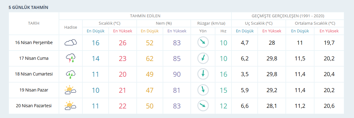 Yapılan değerlendirmelerde ülkenin güney kesimlerinde toz taşınımının etkili olacağı bu durumun özellikle hava kalitesinde düşüşe ve görüş mesafesinde azalmaya neden olabileceği belirtildi. 16 Nisan Perşembe günü itibarıyla Türkiye genelinde yağış beklenmezken yalnızca Batı Karadeniz’in yüksek kesimleri, İç Anadolu’nun kuzeyi ve Doğu Akdeniz’deki Toroslar bölgesinde kısa süreli ve yerel sağanak geçişleri öngörülüyor. Hava sıcaklıklarının ise ülke genelinde 20 derecenin üzerinde seyretmeye devam edeceği bildirildi.