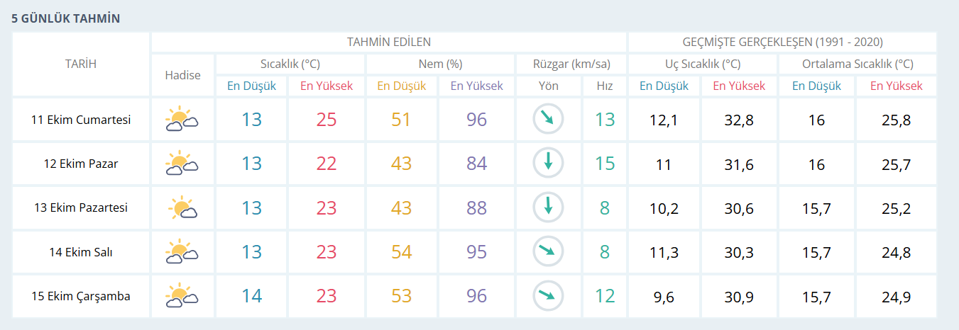 Meteoroloji verilerine göre İzmir’de (bugün) 11 Ekim Cumartesi günü hava az bulutlu ve açık olacak ve sıcaklık 25 dereceye kadar yükselecek. 12 Ekim Pazar günü ise hava sıcaklığında düşüş yaşanacak ve termometreler 22 dereceyi gösterecek. İzmir’de bir günde termometreler 3 derece birden düşecek.