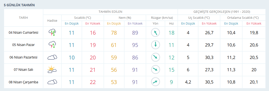 5 Nisan Pazar günü ise sıcaklığın 19 dereceye kadar yükselmesi öngörülüyor. Ancak artan sıcaklığa rağmen yağışlı sistemin İzmir genelinde etkisini sürdüreceği ve gök gürültülü sağanakların devam edeceği ifadeceği bildirildi.