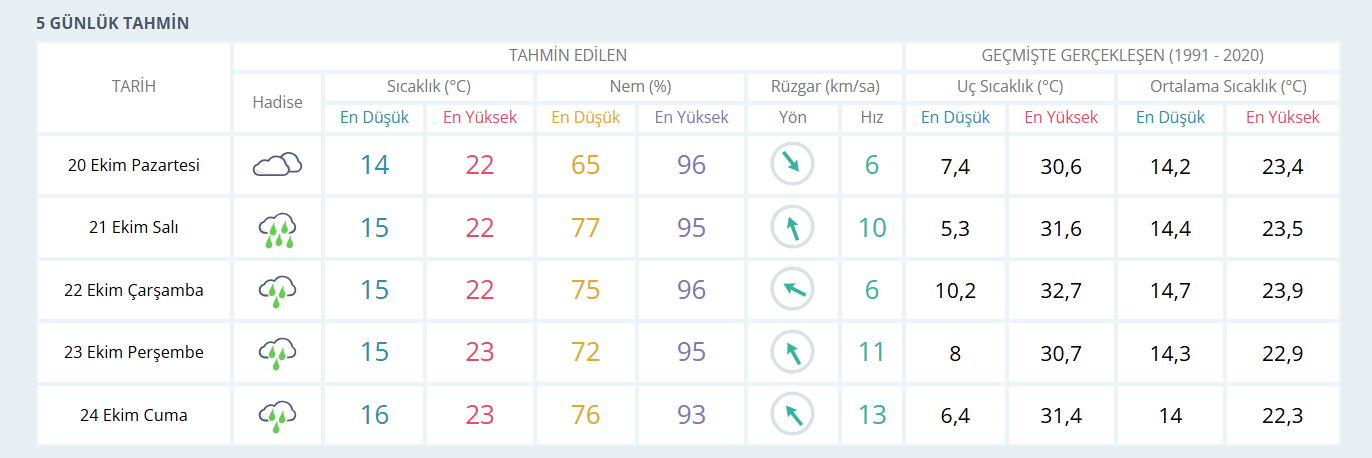 Tahminlere göre 20 Ekim Pazartesi günü İzmir genelinde sıcaklık 22 derece olacak ve gece saatlerinden itibaren birçok ilçede yağışlar başlayacak. 21 Ekim Salı günü sağanak yağışlar sürecek hava 22 derece civarında seyredecek. 22 Ekim Çarşamba günü de yağışlar etkisini koruyacak. 23 Ekim Perşembe günü sıcaklık 23 dereceye çıkarken yağışlı hava sürecek. 24 Ekim Cuma günü de İzmir genelinde yağışların devam edeceği öngörülüyor.