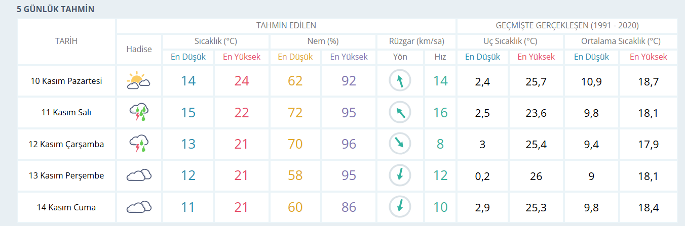 12 Kasım Çarşamba günü 21 derece sıcaklıkta sağanak yağışların devam etmesi bekleniyor. 13 Kasım Perşembe ve 14 Kasım Cuma günleri ise yağışların yerini bulutlu bir havaya bırakması öngörülüyor. Sıcaklıkların hafta boyunca 21–24 derece aralığında seyretmesi bekleniyor.