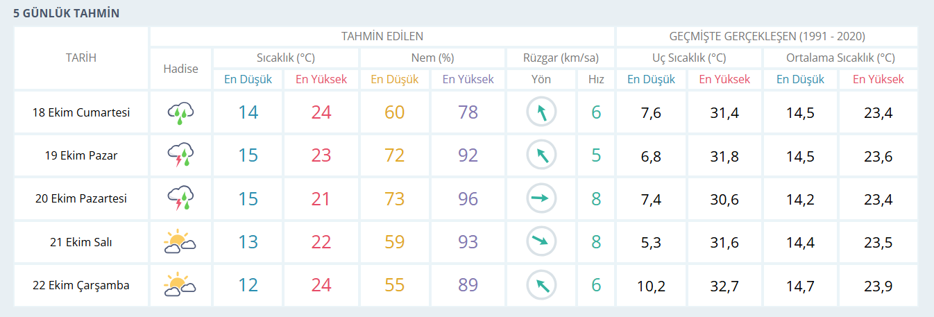 Meteoroloji verilerine göre 18 Ekim Cumartesi günü yağışlar İzmir genelinde başlayacak ve özellikle pazar günü şiddetlenerek sağanaklarla devam edecek. Pazartesi günü sıcaklıkların 21 dereceye düşmesi beklenirken salı günü hava 22 derece civarında olacak. Çarşamba günü sıcaklık 24 dereceye çıkacak ve yağış beklenmiyor.