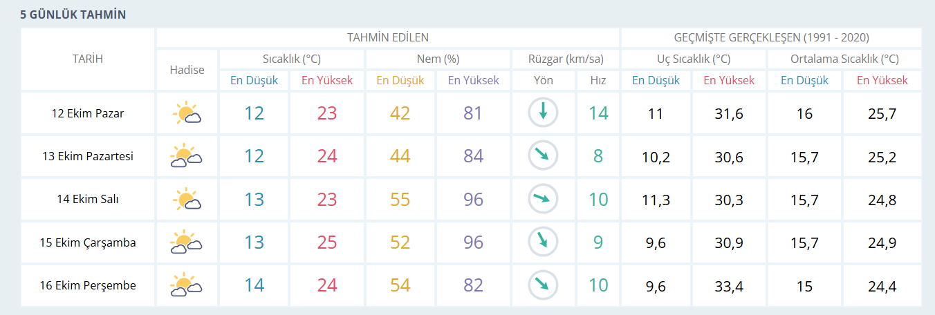 Hafta sonunun ardından yeni haftanın ilk günlerinde sıcaklıklar bir miktar artacak. 13 Ekim Pazartesi günü 24 dereceyle başlayacak hava salı günü 23 dereceye gerileyip çarşamba günü tekrar 25 dereceye yükselecek.