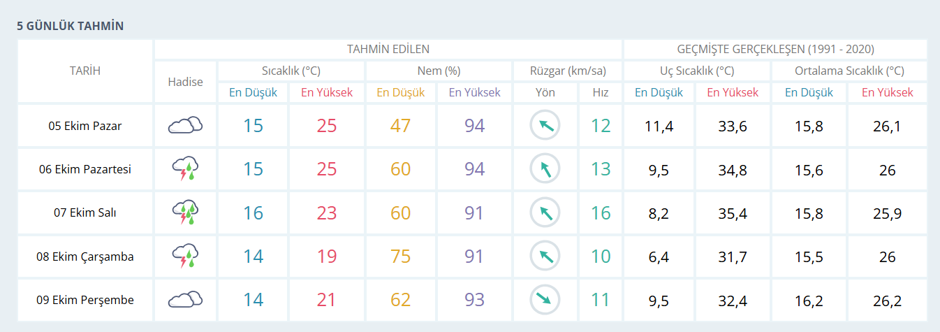 İzmir'de serin hava dalgasıyla birlikte sıcaklıklarda da önemli bir düşüş yaşanacak. Meteoroloji tahminlerine göre 5 Ekim Pazar ve 5 Ekim Pazartesi günleri 25 derece civarında seyredecek olan hava sıcaklığı, 7 Ekim Salı günü 23 dereceye, 8 Ekim Çarşamba günü ise 19 dereceye kadar gerileyecek. 9 Ekim Perşembe günü sıcaklıkların 21 derece civarında olması bekleniyor. İzmir'de serin ve yağışlı havanın hafta sonuna kadar etkili olacağı öngörülüyor.