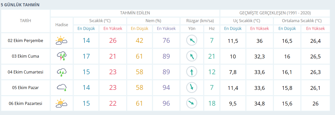 Hafta ortasına kadar mevsim normallerinde seyreden sıcaklıkların yağışla birlikte belirgin şekilde düşmesi bekleniyor. Meteoroloji tahminlerine göre İzmir’de hava 2 Ekim Perşembe günü 26°C,3 Ekim Cuma günü 21°C, 4 Ekim Cumartesi - 5 Ekim Pazar ise 22-23°C civarında seyredecek. Serin ve yağışlı havanın hafta sonuna kadar etkisini sürdürmesi öngörülüyor.