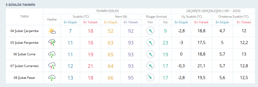 Meteoroloji değerlendirmelerine göre 4 Şubat Çarşamba günü İzmir’de hava sıcaklığı 18 dereceye kadar yükselirken parçalı bulutlu hava sürecek bazı ilçelerde yağış görülecek. 5 Şubat Perşembe günü sıcaklıkların 16 dereceye düşmesiyle birlikte kuvvetli sağanak yağış bekleniyor. 6 Şubat Cuma günü hava sıcaklıklarının 19 derece civarında seyretmesi ve sağanak yağışların yeniden etkili olması öngörülüyor. 7 Şubat Cumartesi günü sağanak yağış beklenirken sıcaklıkların 21 dereceye kadar çıkacağı tahmin ediliyor. 8 Şubat Pazar günü ise yağışlı havanın devam etmesi ve sıcaklıkların 18 derece civarında olması bekleniyor.