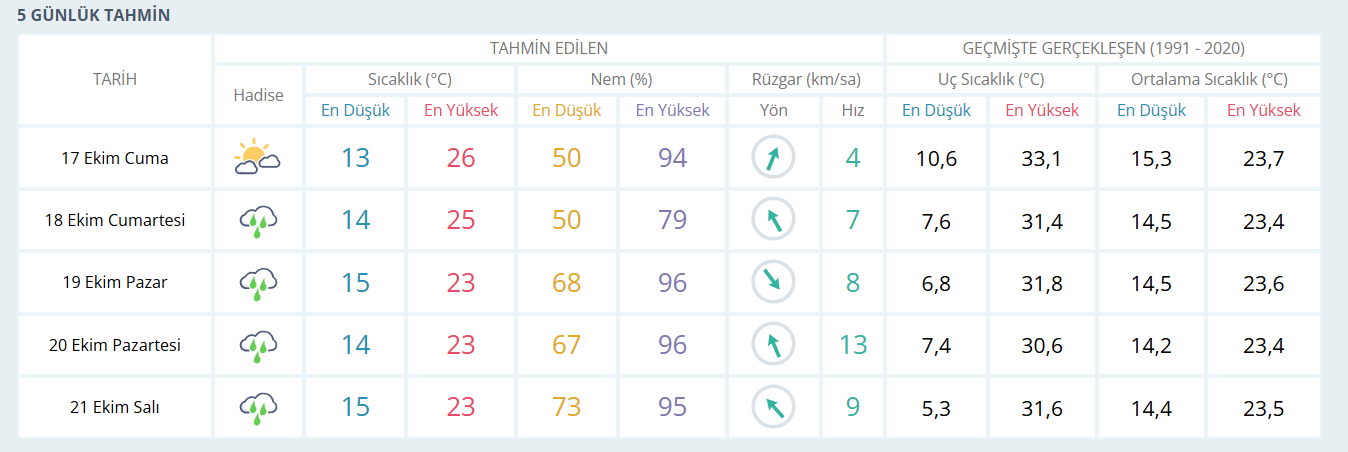 Meteoroloji verilerine göre 17 Ekim Cuma günü İzmir'de hava parçalı ve az bulutlu olacak ve sıcaklık 26 derece civarında ölçülecek. 18 Ekim Cumartesi günü sağanak yağışlar başlarken sıcaklıkların 25 derece civarında olacağı tahmin ediliyor. 19 Ekim Pazar günü yağışlar devam edecek ve hava sıcaklığı 23 dereceye düşecek. Yeni haftanın ilk günleri olan 20 Ekim Pazartesi ve 21 Ekim Salı günlerinde de sağanak yağışlar sürecek, hava 23 derecelerde seyredecek.