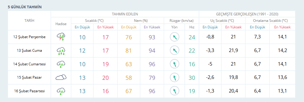Meteoroloji verilerine göre 12 Şubat Perşembe günü İzmir’de hava sıcaklığının 17 derece olması ve kuvvetli sağanak yağışın etkili olması bekleniyor. 13 Şubat Cuma günü de 17 derece ve sağanak yağışlı bir hava tahmin ediliyor. 14 Şubat Cumartesi ve 15 Şubat Pazar günleri ise hava sıcaklıklarının 19 ila 20 derece arasında olması, yağışların hafta sonu boyunca devam etmesi öngörülüyor.