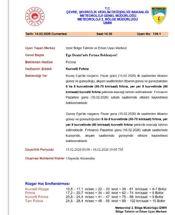 Meteoroloji Genel Müdürlüğü Analiz ve Tahmin Merkezi, Kuzey ve Güney Ege’de kuvvetli fırtına uyarısı yaptı. pazar günü bölgede rüzgarın güney ve güneydoğu yönlerinden başlayıp akşam saatlerinde güney ve güneybatı yönlerine döneceği, hızının 50-75 km/saat arasında değişeceği belirtildi. Yer yer rüzgarın 90 km/saat hızla kuvvetli fırtına etkisi gösterebileceği kaydedildi. Fırtınanın pazartesi sabah saatlerine kadar etkili olacağı öngörülüyor.