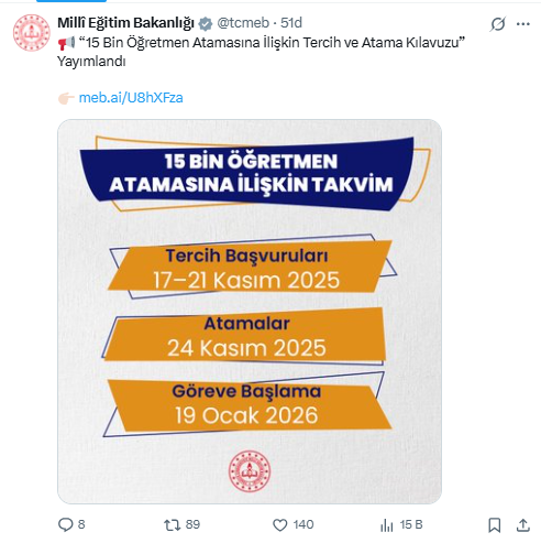 Milli Eğitim Bakanlığı, "15 bin sözleşmeli öğretmen istihdamı kapsamındaki tercih başvuruları, 17–21 Kasım 2025 tarihleri arasında alınacak olup atamalar 24 Kasım 2025 tarihinde yapılacak" açıklamasını yaptı.