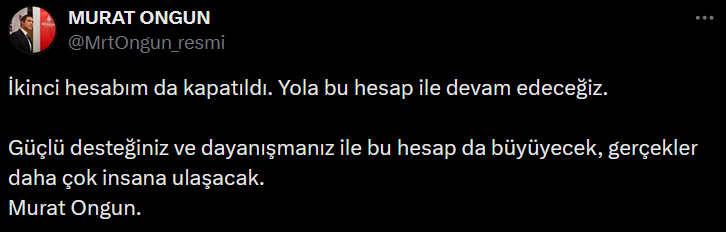 İBB davası kapsamında 23 Mart 2025’ten bu yana tutuklu bulunan İstanbul Büyükşehir Belediyesi (İBB) Medya A.Ş. eski Yönetim Kurulu Başkanı Murat Ongun’un X hesabı kapatılmıştı. Ongun, daha önce kapatılan hesabının yerine açtığı yeni hesabının da kapatıldığını, X üzerinden duyurdu.