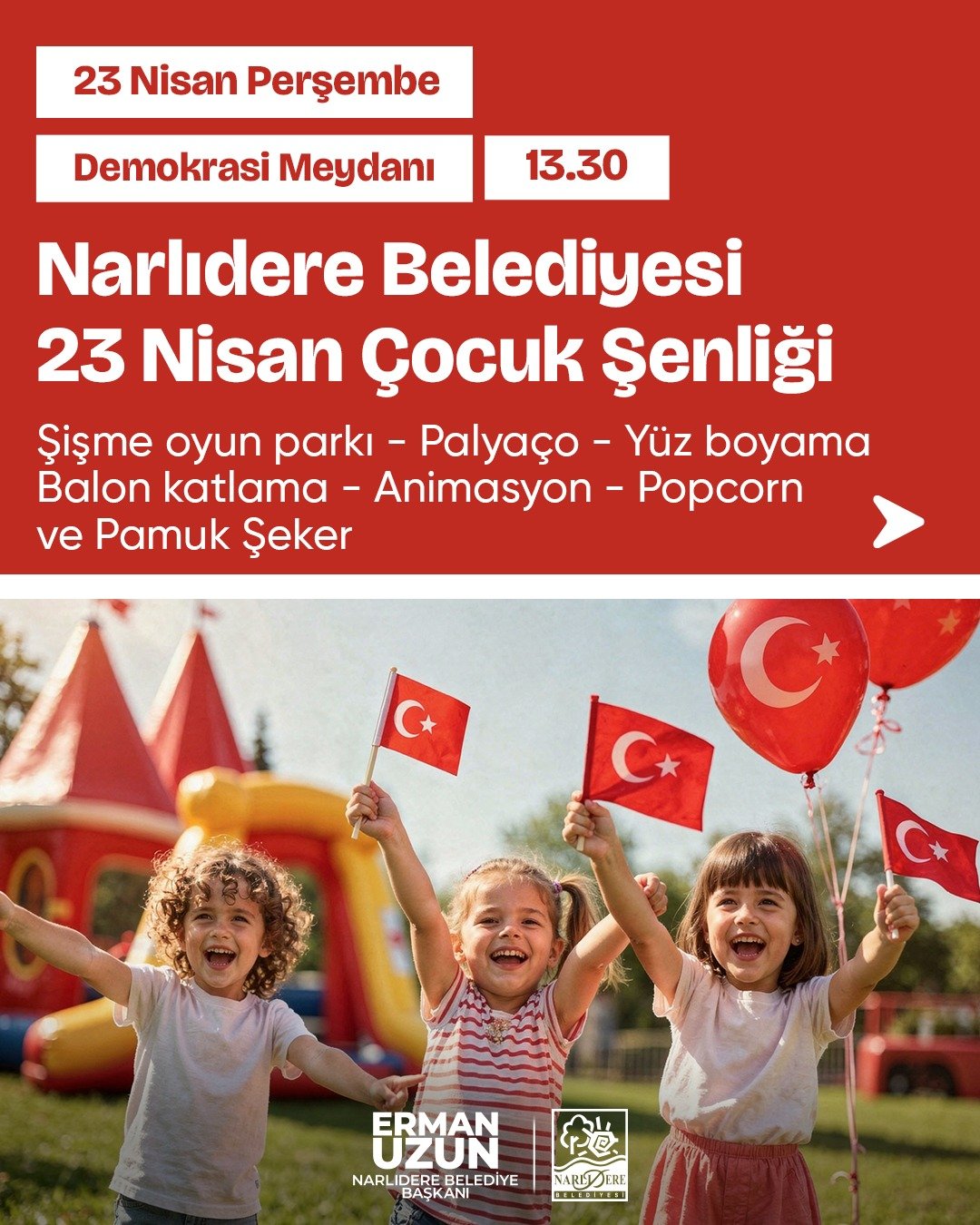 Narlıdere Belediyesi, Cumhuriyetimizin kurucusu, Ulu Önderimiz Gazi Mustafa Kemal Atatürk’ün tüm dünya çocuklarına armağan ettiği 23 Nisan Ulusal Egemenlik ve Çocuk Bayramı kapsamında çocuk şenliği düzenleyecek. Çocuk Şenliği, 23 Nisan Perşembe günü, saat 09.45’te Narlıdere Ahmet Piriştina Demokrasi Meydanı’nda gerçekleştirilecek resmi törenlerin ardından yine aynı meydanda saat 13.30’da başlayacak.